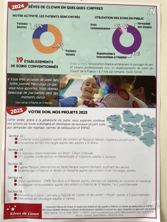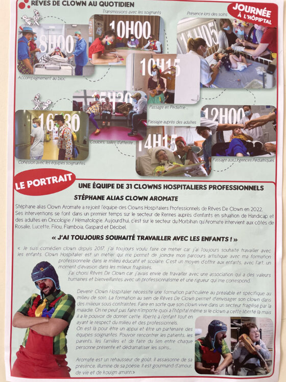 Les volontaires reçoivent une formation d’entre 5 et 10 semaines, puis ils deviennent ensuite clowns hospitaliers. Créer en 1999, l’association est bretonne. Depuis 2015, le métier de clown hospitalier est reconnu par le gouvernement français. Les clowns hospitaliers accompagnent en majorité des enfants, en pédiatrie et en néo-natalité, mais ils peuvent aussi accompagner des adultes. Les deux bénévoles ont présenté les avantages et les apports pour les malades de la présence d’un couple de clown à leurx côtés.